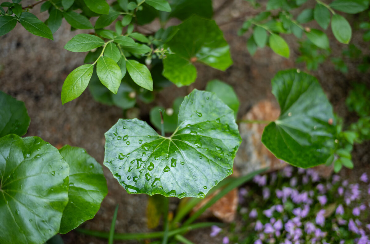 朝の水やりで葉に溜まった水滴が光る瞬間。