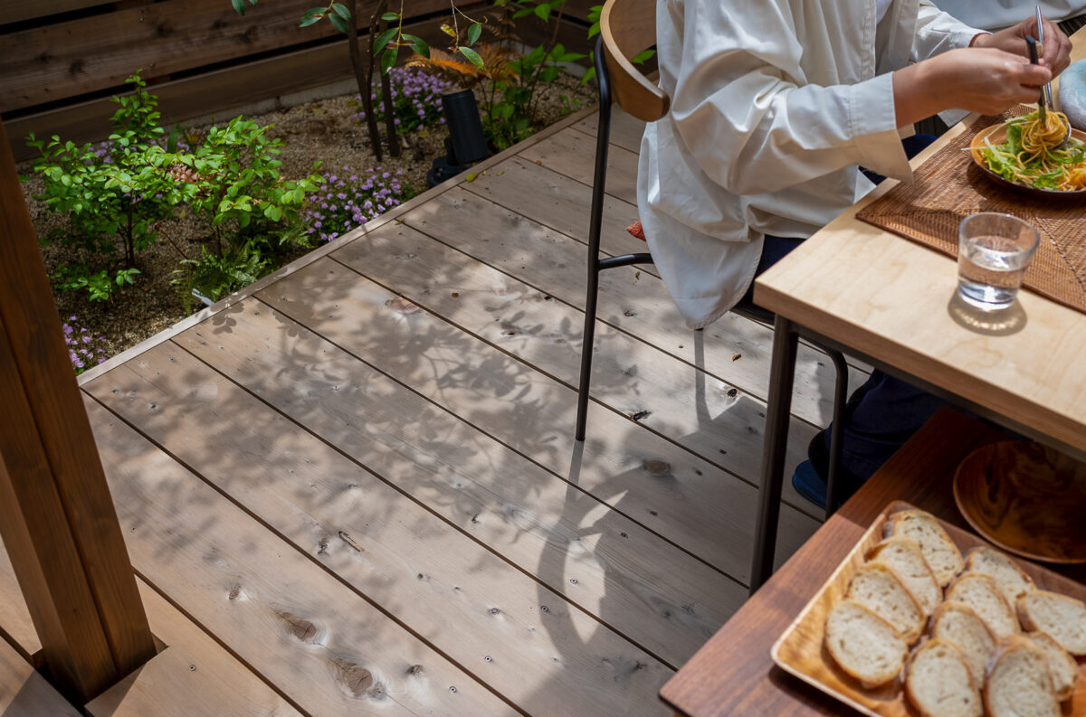 たとえばモデルルームのウッドデッキで、育てた野菜を使ったランチタイム。