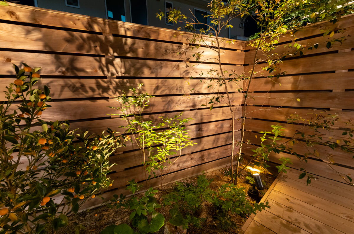 やわらかな灯りが木の枝や外壁を照らし、夜の庭にほんのりと温もりを残してくれる。